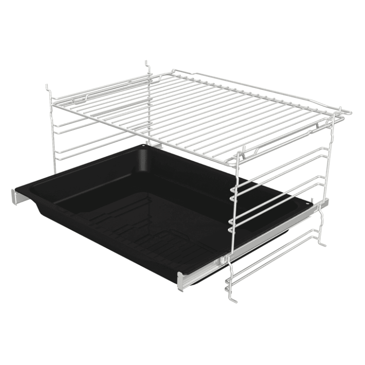 As guias telescópicas facilitam muito a inserção e remoção dos tabuleiros e grelhas no interior do forno.